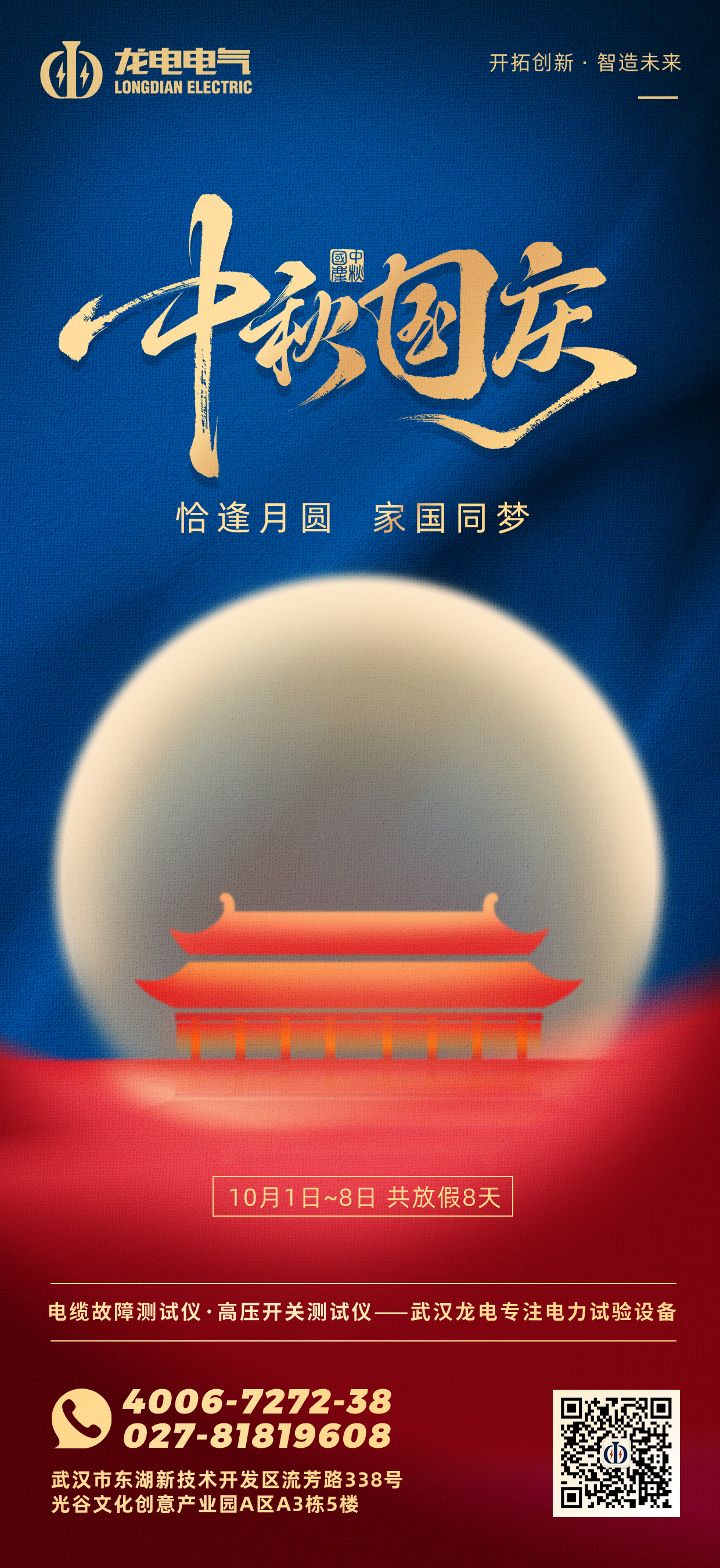 秋色宜人,月圓情濃。值此中華人民共和國(guó)成立76周年華誕暨傳統(tǒng)中秋佳節(jié)來(lái)臨之際,武漢市龍電電氣設(shè)備有限公司全體員工向您致以最誠(chéng)摯的節(jié)日問(wèn)候與祝福!